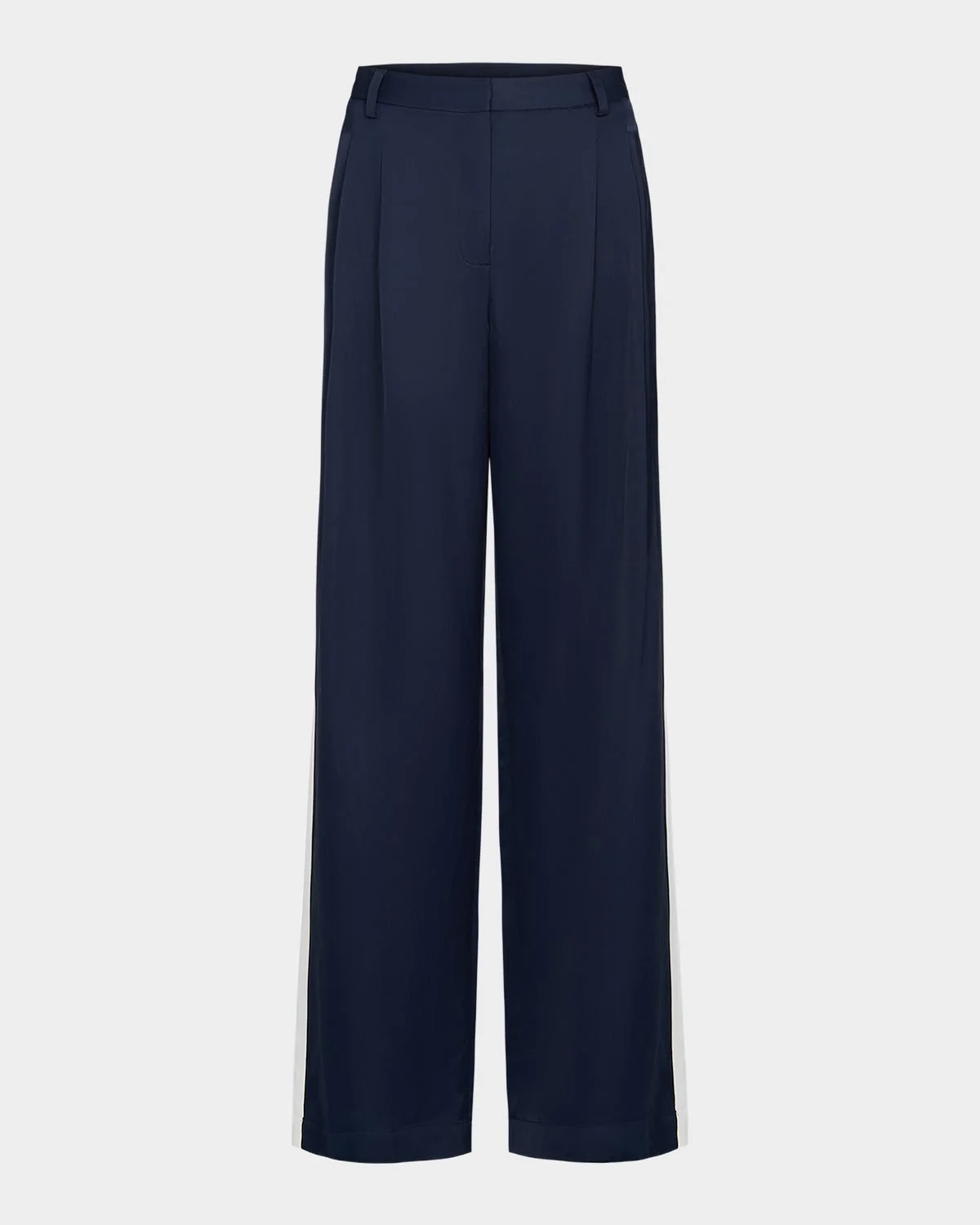 Crafted from & nbsp; European flax linen with viscose coating for an elegant drape and satiny sheen, the "Sulli" pants by TWP feature contrasting satin tuxedo stripes along the side seams Mid rise Side pockets Full length Relaxed legs Concealed hook-and-eye/zip fly; belt loops Viscose/linen Dry clean Made in USA