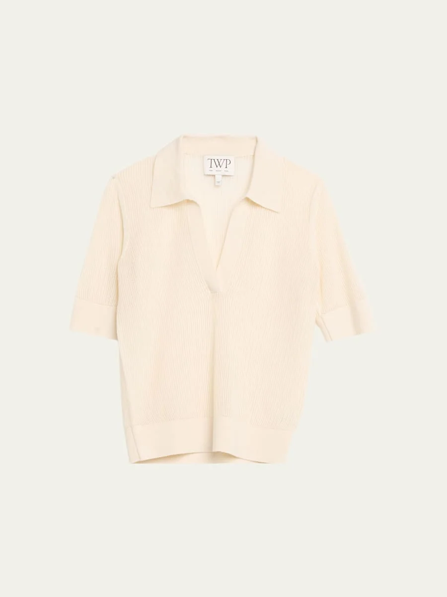 Finished with ribbed trim, this polo sweater by TWP is knit from superfine Italian cashmere in a softly structured silhouette Open V neckline Elbowlength sleeves Relaxed fit Hip length Pullover style Wool Dry clean Imported SIZE amp; FITModel measurements: 5'10" tall Model is wearing a US size 4/Small