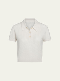 TWP textured thermal sweater Approx. 17"L from shoulder to hem Polo collar; three-button placket Short sleeves Relaxed fit Hip length Pullover style Cashmere Dry clean Imported Online Inquiries: BGS21_T6T1E| Store Inquiries: #5031059