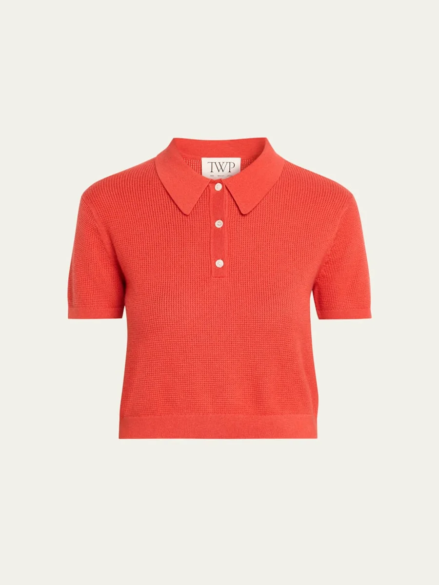 TWP textured thermal sweater Approx. 17"L from shoulder to hem Polo collar; three-button placket Short sleeves Relaxed fit Hip length Pullover style Cashmere Dry clean Imported Online Inquiries: BGS21_T8TDT| Store Inquiries: #5031059