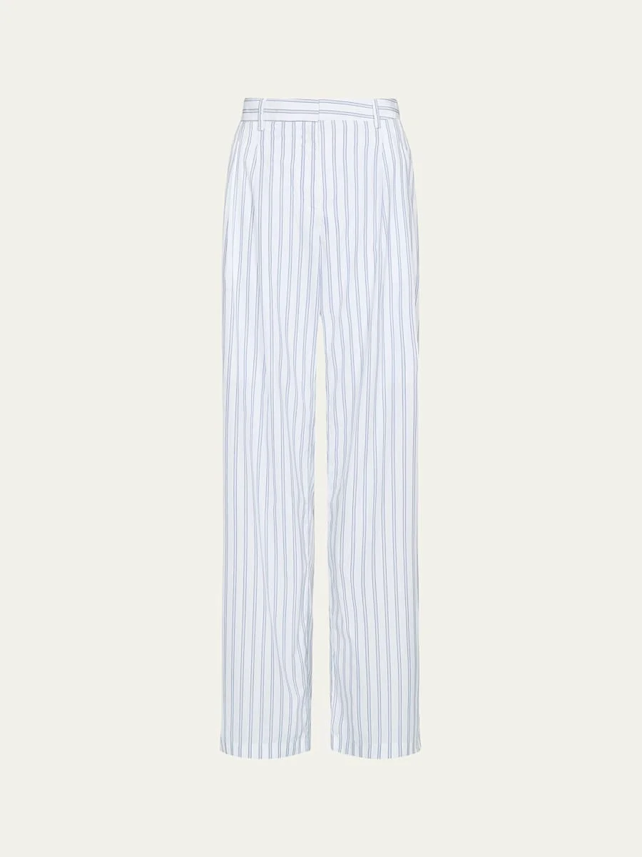 Crafted from lightweight poplin with bold and narrow stripes woven together, the "Sulli" pants by TWP are finished with front pleats for added volume High rise Side pockets Full length Wide legs Concealed hookandeye/zip fly; belt loops Cotton Made in USA