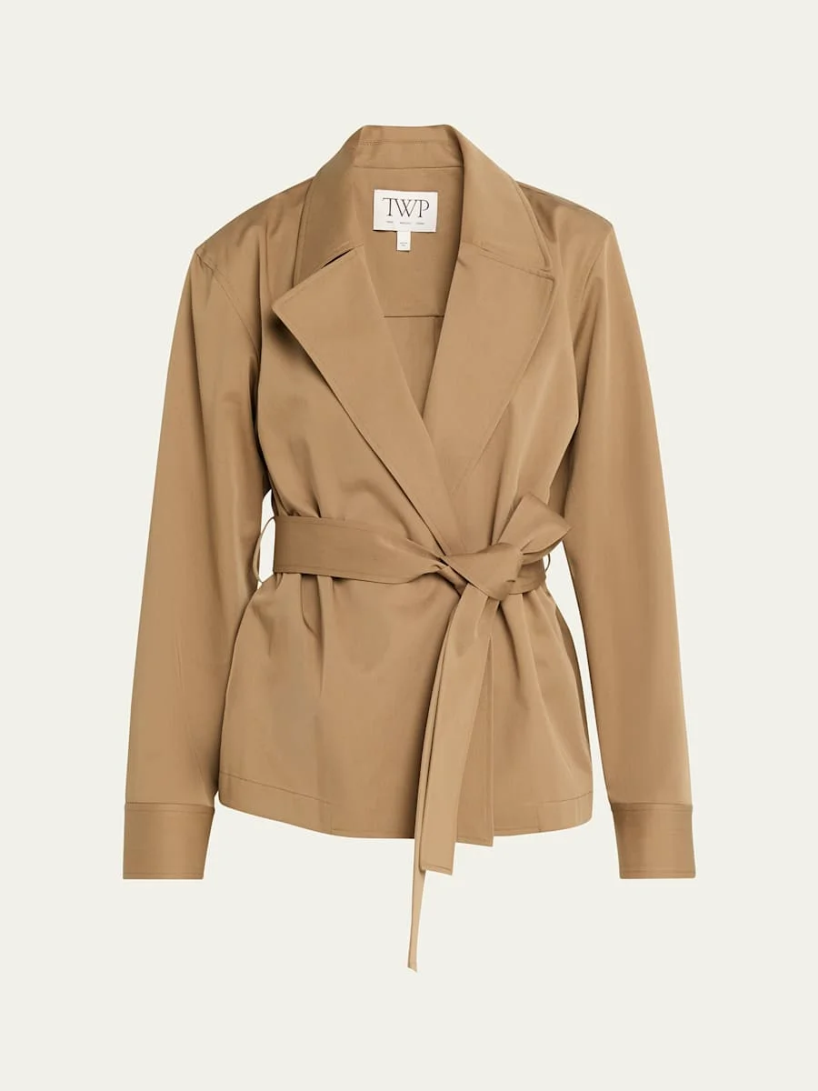 TWP "Wrap Me Up" short trench coat crafted from superfine Italian cotton Notch lapels Doublebreasted front Long sleeves with button cuffs Selftie belt Classic fit Hem sits at the hip Wrap closure Cotton Dry clean Made in USA SIZE amp; FITModel measurements: 5'10" tall Model is wearing a US size 4/Small