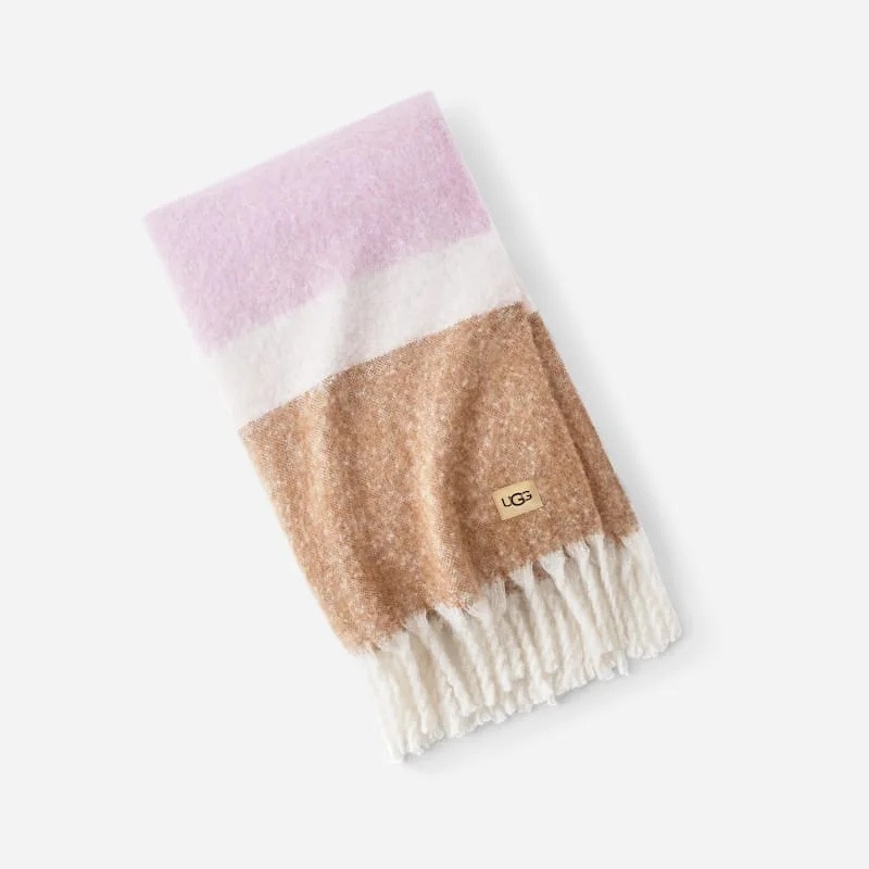 Our Simona Throw blanket. The perfect accent. Made with a super soft faux mohair fabric, it features our signature logo at the bottom. 90% polyester, 10% wool. 50x70 inch. The UGG® Logo faux leather label. 4-way ribbon. UGG® Simona Throw 50 inch x 70 inch Blankets in Rosetta Stripe