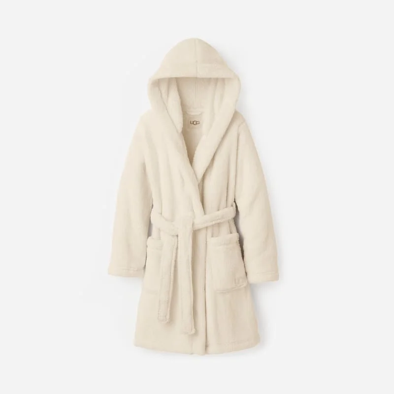 Our Aarti Robe delivers extra warmth and ultimate comfort when you really need it. Need we say more? Relaxed-fit hooded lounge plush fleece robe. Self - 100% recycled polyester. Lining - Unlined. Self belt. Front patch pockets. The UGG® Logo embroidered on wearer's left pocket. 37 1/4 inch HPS length [size S]. 43 3/8 inch HPS length [size 2X]. Imported. UGG® Women's Aarti Fleece Tops in Cream, Size S