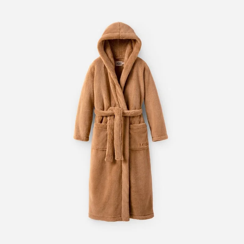 Made of plush fleece, our Aarti Long is a full-length extension of our ultra-cozy Aarti Robe. Featuring front patch pockets and a self-belt, it pairs perfectly with loungewear and your favorite slippers.This product was made in a factory that supports women in our supply chain with the help of HERproject. This collaborative initiative creates partnerships with brands like ours to empower and educate women in the workplace. Relaxed-fit hooded lounge plush fleece midi-length robe. Self - 100% Recycled polyester. Lining - Unlined. Self belt. Front patch pockets. The UGG® Logo embroidered on wearer's left side pocket. 52 inch HPS Length [Size S]. 52 inch HPS Length [Size 2X]. Imported. UGG® Women's Aarti Long Fleece Tops in Chestnut, Size 2X