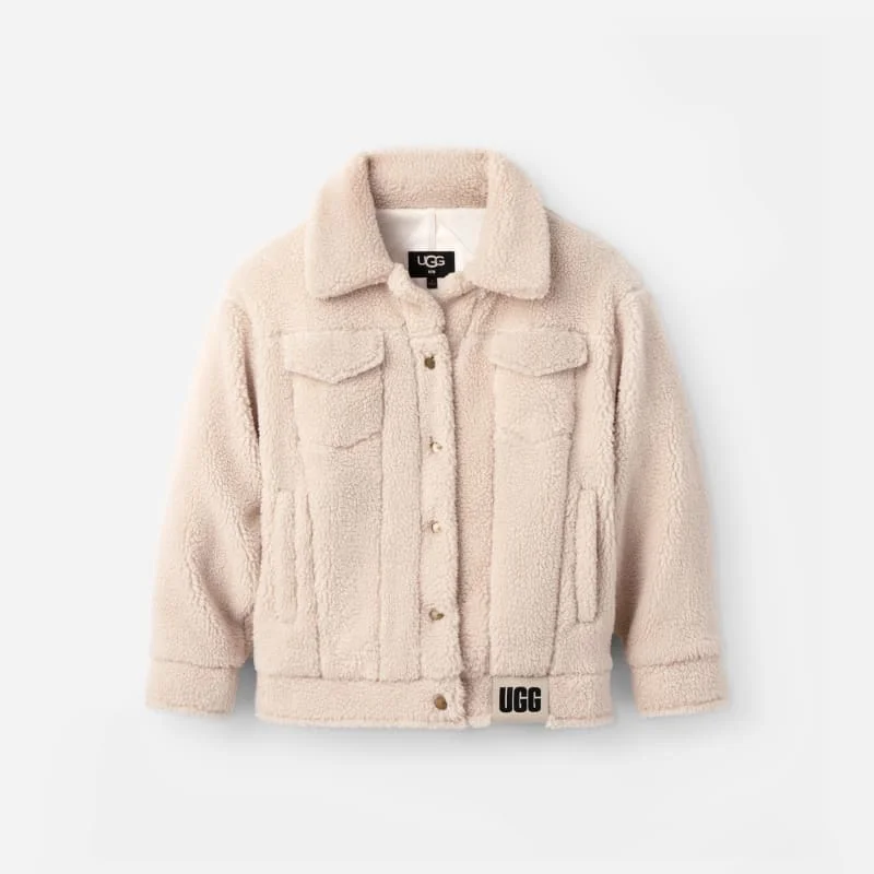 The reviews are in, so we'll just let them speak for us here: inch From the minute I saw it I knew I had to have it in my life and, honestly, it's everything I ever could have hoped for. inch Yep, that's either the love of your life or our bestselling Frankie Trucker Jacket - bringing in all the high marks and the gold stars. She's an ultra-soft, oversized layer with timeless trucker styling, this jacket is crafted with 100% recycled materials on the outside. Add Frankie to cart now, take her out of your closet season after season.This product was made in a factory that supports women in our supply chain with the help of Reimagining Industry to Support Equality (RISE). This collaborative initiative creates partnerships with brands like ours to empower and educate women in the workplace. Oversized-fit plush fleece trucker jacket. Self - 100% Recycled Polyester. Lining - 94% Polyester/6% Elastane. Center front closure with The UGG® Logo snaps. Chest pockets with flap and hidden snap closure. Metal snap closures at cuff. Side pockets with soft fleece hand warmer pocket linings. The Graphic UGG® Font woven label at waistband. 27 1/2 inch HPS Length [Size S]. 29 7/8 inch HPS Length [Size 2X]. Imported. This product was made in a factory that supports women in our supply chain with the help of Reimagining Industry to Support Equality (RISE). This collaborative initiative creates partnerships with brands like ours to empower and educate women in the workplace.. UGG® Women's Frankie Sherpa Trucker Jacket Fleece/Recycled Materials in Natural Ii, Size S