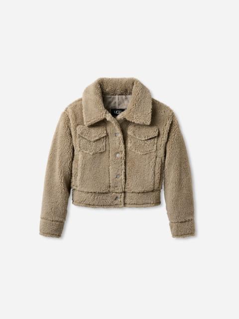 When the Feel of UGG® and iconic utilitarian style collide, you get our Frankie Short Trucker Jacket. Designed with a slightly cropped length for easy layering, it's made with ultra-soft plush fleece and finished with a smooth Sun Logo Shape lining that finishes any 'fit.This product was made in a factory that supports women in our supply chain with the help of Reimagining Industry to Support Equality (RISE). This collaborative initiative creates partnerships with brands like ours to empower and educate women in the workplace. Relaxed-fit short plush fleece trucker jacket. Self - 100% recycled polyester. Lining - 100% nylon jacquard lining with The Sun Logo Shape. Center front placket with The UGG® Logo snaps. Chest pockets with flap and hidden snap closure. Side welt pockets with soft fleece hand warmer pocket linings. Metal snap closures at cuff. The UGG® Logo label. 21 inch HPS length [size S]. 26 inch HPS length [size 2X]. Imported. UGG® Women's Frankie Short Trucker Jacket Fleece in Natural Ii, Size 1X