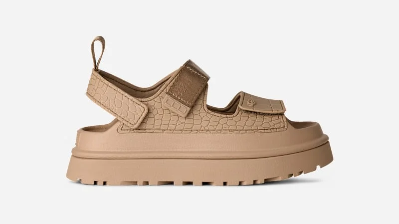 You're one of a kind. Our Golden Glow Embossed sandal features an embossed croc print that's unique to each pair and as individual as you are. The outsole is made with ultra-lightweight sugarcane EVA, while the straps and upper liner are crafted from 100% recycled fibers for endless comfort and feel-good vibes.This product was made in a factory that supports women in our supply chain with the help of Reimagining Industry to Support Equality (RISE). This collaborative initiative creates partnerships with brands like ours to empower and educate women in the workplace. Embossed TPU upper. Rear pull tab made from 100% recycled polyester fibers. Hook-and-loop closure, Straps are made with 100% recycled polyester fibers. The upper lining textile is made with 100% recycled polyester fibers. Sugarcane EVA midsole. Sugarcane EVA outsole. RN 88276. UGG® Women's Golden Glow Embossed in Mustard Seed, Size 9