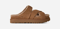 Slippers or sandals? Why choose. Our Greenport Cross Strap Slide keeps you cozy at home and serves all the comfort as you run around town. The genuine suede upper and sheepskin lining are the UGG® details you know and love, while the crisscross cutout straps breathe new life and make this slide anything but basic. Finished off with a sugarcane EVA outsole for lightweight cushioning, no matter where you wear them.This product was made in a factory that supports women in our supply chain with the help of Reimagining Industry to Support Equality (RISE). This collaborative initiative creates partnerships with brands like ours to empower and educate women in the workplace. Suede upper. Suede mudguard, Fixed suede straps. 10mm sheepskin lining. 10mm sheepskin insole. Sugarcane EVA midsole. Sugarcane EVA outsole. Textile binding made from 100% recycled polyester fibers. The UGG® Logo, heat-embossed, Woven label with The UGG® Logo on insole. RN 88276. This product contains real fur from sheep or lamb. Fur may be sourced from Australia, Ireland, the United Kingdom, or the United States. It has been artificially dyed and treated.. UGG® Women's Greenport Cross Strap Slide Sheepskin in Chestnut, Size 5