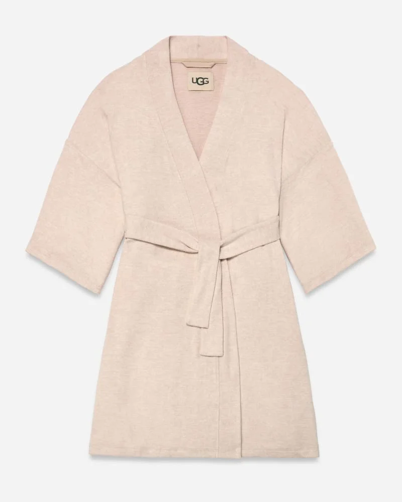 The Monrose robe is made of a super-soft peached knit and has three-quarter sleeves for that laid-back spa look.This product was made in a factory that supports women in our supply chain with the help of HERproject. This collaborative initiative creates partnerships with brands like ours to empower and educate women in the workplace. 3/4 Sleeve Robe. Peached Knit- 79% LENZING ECOVERO Viscose/18% Polyester/3% Elastane. Self Tie Waistband. Self Interior Tie Closure. Cross Grain Cotton Hanger loop. UGG® woven flag label clamped onto the wearer's left pocket (1/2 inch up from bottom of opening). 36 3/4 inch HPS Length [Size S]. 41 inch HPS Length [Size 2X]. Imported. UGG® Women's Monrose Robe LENZINGu2122 ECOVEROu2122 Viscose Blend Tops in Oatmeal Heather, Size L