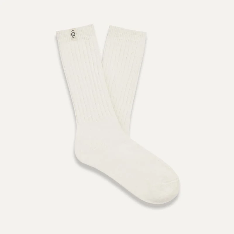 These ultra-soft knit socks are a fan favorite. Our Rib Knit Slouchy Crew sock is the perfect combo of texture and style. Soft knit crew sock. 99% recycled polyester/1% elastane. 11 inch height. Soft twill tape with The UGG® Logo on top cuff. Packaged with hanger and belly band. Fits shoe size: 5-10. Imported. UGG® Women's Rib Knit Slouchy Crew Sock Polyester Blend/Recycled Materials in White/