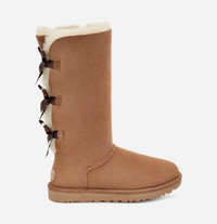 We added silky bows to our icon for a sweet, feminine take. Crafted with soft sheepskin, this versatile boot incorporates a durable, lightweight sole to increase cushioning and traction. Pair with practically anything, from athleisure wear to flowy dresses.This product was made in a factory that supports women in our supply chain with the help of HERproject. This collaborative initiative creates partnerships with brands like ours to empower and educate women in the workplace.The outsole of this product is either a sugarcane EVA outsole, which is a responsible compound using sugarcane foam that allows us to reduce dependency on fossil fuels by replacing petroleum-based ethylene, or a Treadlite by UGG® outsole. Protected: Post Applied Treatment. Topically applied water repellency treatment. 17mm Twinface sheepskin upper. Fixed satin bows along back shaft, Suede heel counter. 17mm sheepskin lining. 17mm sheepskin insole. Sugarcane EVA outsole or Treadlite by UGG® EVA outsole. Polyester binding or textile binding made from 100% recycled polyester fibers. 12.25 inch shaft height. The UGG® Logo embossed leather heel label. Best for: Casual. RN 88276. This product contains real fur from sheep or lamb. Fur may be sourced from Australia, Ireland, the United Kingdom, or the United States. It has been artificially dyed and treated.. UGG® Women's Bailey Bow Tall II Boot Sheepskin Classic Boots in Brown/, Size 7