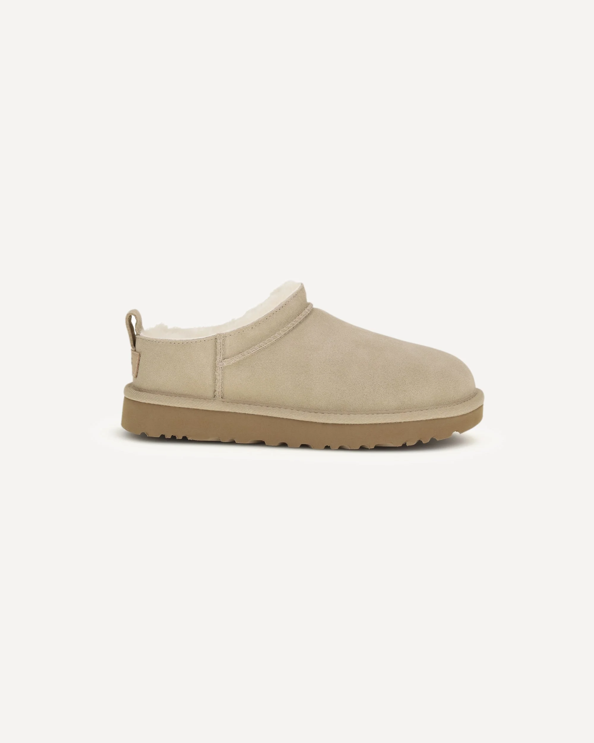 The Classic Micro Boots by Ugg are an icon of comfort and timeless style. They feature a genuine suede upper, lined internally with super-soft sheepskin for a cozy, warm feel. The lightweight EVA sole made from sugarcane provides natural support and comfort comparable to that of a slipper. The water-repellent treatment makes the suede water-resistant, ideal for everyday use. The model is completed by a practical rear pull tab and logo details: a fabric label with the UGG® logo on the insole and a leather label with the UGG® logo embossed on the heel. DETAILS - Sku: 1173891W_SAN - Season: SS26 - Composition: UPPER 100% Calf Leather Bos Taurus SOLE 100% Rubber - MADE IN CHINA