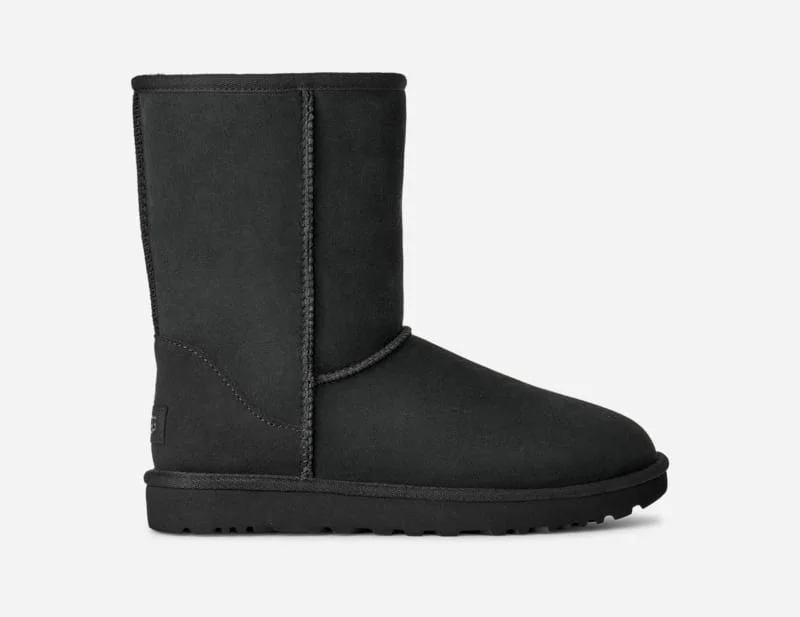 Born on the beaches of California, our Classic Boot was originally made to keep surfers warm after early-morning sessions and has since become an icon of West Coast cool. It's crafted with our famously soft sheepskin, which naturally wicks away moisture so you can wear it anywhere - both indoors and out.The outsole of this product is either a sugarcane EVA outsole, which is a responsible compound using sugarcane foam that allows us to reduce dependency on fossil fuels by replacing petroleum-based ethylene, or a Treadlite by UGG® outsole.This product was made in a factory that supports women in our supply chain with the help of Reimagining Industry to Support Equality (RISE). This collaborative initiative creates partnerships with brands like ours to empower and educate women in the workplace. Protected: Post Applied Treatment. Topically applied water repellency treatment. 17mm Twinface sheepskin upper. Overlock stitch detailing on seams, Suede heel counter. 17mm sheepskin lining. 17mm sheepskin insole. Sugarcane EVA outsole or Treadlite by UGG® EVA outsole. Polyester binding or textile binding made from 100% recycled polyester fibers. 8 inch shaft height. The UGG® Logo embossed leather heel label. Best for: Casual. RN 88276. This product contains real fur from sheep or lamb. Fur may be sourced from Australia, Ireland, the United Kingdom, or the United States. It has been artificially dyed and treated.. UGG® Women's Classic Short II Sheepskin Classic Boots in Black/, Size 9