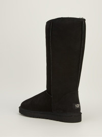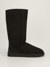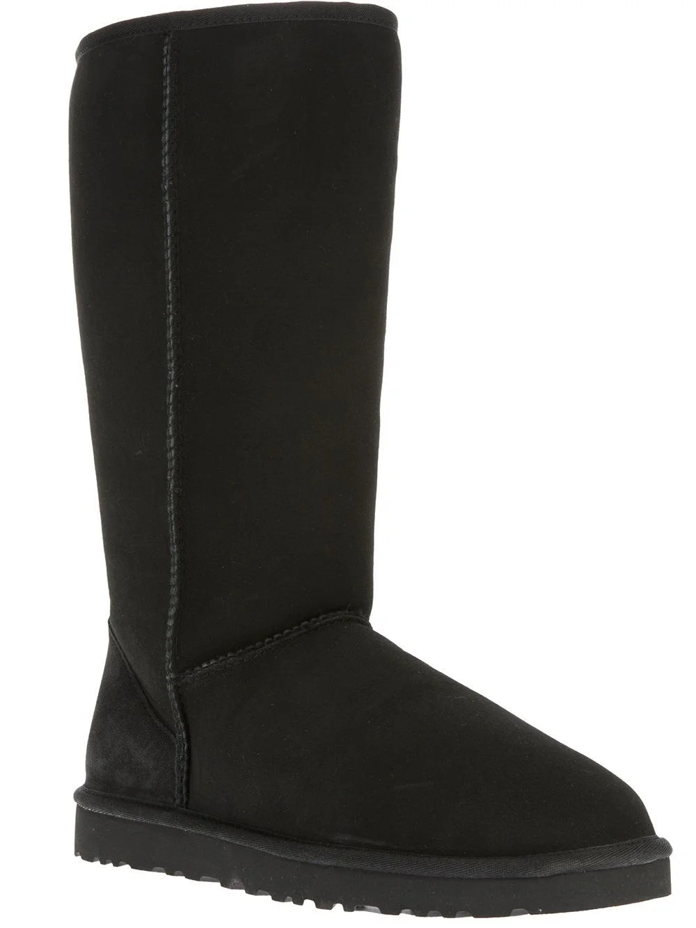 'Classic Tall' boot Black suede 'Classic Tall' boot from UGG featuring a round toe, a designer logo patch at the rear, a knee length, a flat sole and a shearling lining. Imported Composition Suede 100% SIZE & FIT Measurement HEIGHT 13.38 in(34 cm) HEEL 1.18 in(3 cm) CIRCUMFERENCE 17.32 in(44 cm)