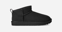 Our Classic Ultra Mini is one of our most coveted Classics. Built-in flair with a lower shaft which makes for easy on-off wear. Pre-treated to keep it looking better for longer, this Classic features everything you love about the original Classic Boot, like signature UGG® sheepskin and a flexible, ultra-lightweight sole. The outsole of this product is either a sugarcane EVA outsole, which is a responsible compound using sugarcane foam that allows us to reduce dependency on fossil fuels by replacing petroleum-based ethylene, or a Treadlite by UGG® outsole.This product was made in a factory that supports women in our supply chain with the help of Reimagining Industry to Support Equality (RISE). This collaborative initiative creates partnerships with brands like ours to empower and educate women in the workplace. Protected: Post Applied Treatment. Topically applied water repellency treatment. 17mm Twinface sheepskin upper. Asymmetrical topline, Overlock stitch detailing on seams, Rear pull tab, Suede heel counter. 17mm sheepskin lining. 17mm UGG®plush 80% upcycled wool, 20% TENCEL Lyocell insole or 17mm UGG®plush 60% upcycled wool, 40% TENCEL Lyocell insole or 17mm sheepskin insole. Sugarcane EVA outsole or Treadlite by UGG® EVA outsole. Polyester binding or textile binding made from 100% recycled polyester fibers. 3.5 inch shaft height. The UGG® Logo embossed leather heel label. Best for: Casual. RN 88276. This product contains real fur from sheep or lamb. Fur may be sourced from Australia, Ireland, the United Kingdom, or the United States. It has been artificially dyed and treated.. UGG® Women's Classic Ultra Mini Sheepskin Classic Boots in Black, Size 12