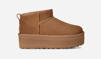 This is one of our most precious styles, and oh, do we have the viral-status receipts to prove it. This ultra, elevated Classic Boot is a must-have combination of newness and nostalgia. It's made with rich suede and lined inside with our UGG®plush blend for signature softness.The outsole of this product is either a sugarcane EVA outsole, which is a responsible compound using sugarcane foam that allows us to reduce dependency on fossil fuels by replacing petroleum-based ethylene, or a Treadlite by UGG® outsole. Suede upper. Overlock stitch detailing on seams, Rear pull tab, Asymmetrical topline. 17mm UGG®plush 80% upcycled wool, 20% TENCEL Lyocell lining or 17mm UGG®plush 60% upcycled wool, 40% TENCEL Lyocell lining. 17mm UGG®plush 80% upcycled wool, 20% TENCEL Lyocell insole or 17mm UGG®plush 60% upcycled wool, 40% TENCEL Lyocell insole. EVA midsole. Sugarcane EVA outsole or Treadlite by UGG® EVA outsole. Polyester binding or 100% recycled polyester binding. 3.5 inch shaft height. 2 inch platform height. The UGG® Logo embossed suede heel label. Best for: Casual. RN 88276. UGG® Women's Classic Ultra Mini Platform Suede Classic Boots in Chestnut, Size 11