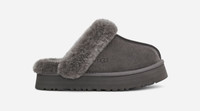 How would you describe yourself? Totally unique? Like to stand out? Want to try both for the first time? Then you are definitely on the right page. Our Disquette adds a 1 inch retro-style platform sole to a familiar slip-on silhouette for outdoor wear, an all-day cushion, and a maximalist look. Crafted from our signature sheepskin and suede, this effortless style adds a playful statement to your life.The outsole of this product is either a sugarcane EVA outsole, which is a responsible compound using sugarcane foam that allows us to reduce dependency on fossil fuels by replacing petroleum-based ethylene, or a Treadlite by UGG® outsole.This product was made in a factory that supports women in our supply chain with the help of Reimagining Industry to Support Equality (RISE). This collaborative initiative creates partnerships with brands like ours to empower and educate women in the workplace. Suede upper. Sheepskin collar. 17mm sheepskin lining. 17mm sheepskin insole. EVA midsole. Sugarcane EVA outsole or Treadlite by UGG® EVA outsole. Textile binding made from 100% recycled polyester fibers. 1 inch platform height. Woven label with The UGG® Logo on insole, The UGG® Logo, heat-embossed. RN 88276. This product contains real fur from sheep or lamb. Fur may be sourced from Australia, Ireland, the United Kingdom, or the United States. It has been artificially dyed and treated.. UGG® Women's Disquette Sheepskin Slippers in Charcoal, Size 8