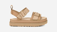 From far-off destinations to local explorations, our Goldenstar Villa sandal delivers lightweight comfort with its renewable sugarcane EVA sole and contoured footbed. The straps are crafted with a soft Nubuck, complete with an adjustable ankle buckle for a custom fit. With quintessential elements like our Overstitched Binding and box stitch details, the Goldenstar Villa brings your favorite Feel of UGG® into the warmer months. Nubuck upper. Adjustable ankle strap, Functional buckle. Textile lining made from 100% recycled polyester fibers. Sockliner textile made with 100% recycled polyester, Sockliner incorporates peppermint-based anti-odor treatment. Contoured EVA footbed. Sugarcane EVA midsole made with recycled EVA regrind. Sugarcane EVA outsole. Recycled polyester binding. The UGG® Logo, heat-embossed. RN 88276. UGG® Women's Goldenstar Villa Nubuck/Leather Sandals in Mustard Seed, Size 7.5
