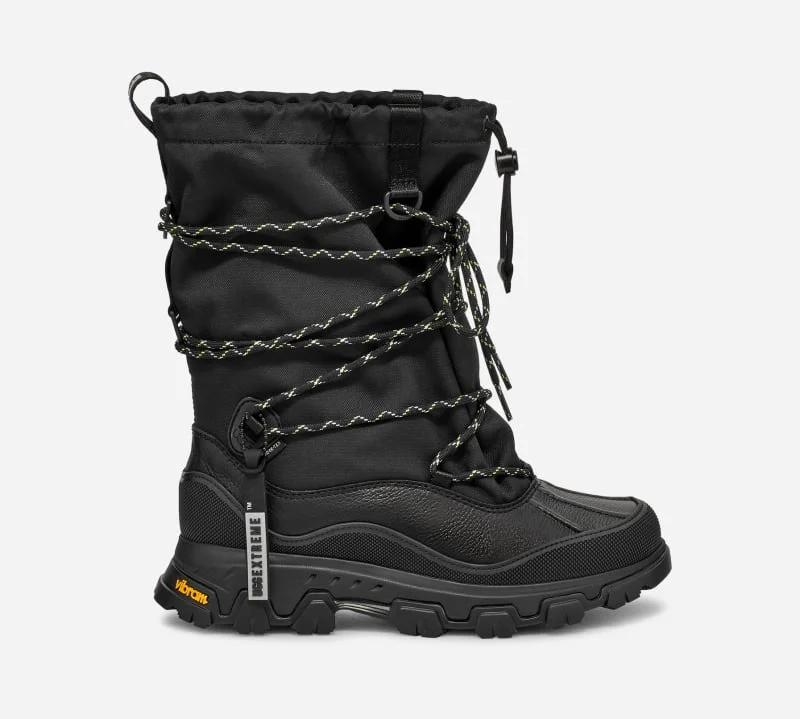 Okay, winter-go off. We welcome your gusts, your misty mornings, your frosty temps. No, seriously, we're ready for you. Well, the Metro Peak Boot sure is. The Metro Peak is our ultra-fab, ultra-tech, all-new winter boot designed to get you where and when you need to go. Metro Peak stands for hyper-versatility. You are getting three boots in one: Wear it up, slouched down, or lace it your way - the Metro Peak delivers tech and style in one beautiful boot. It has an interior bootie lined with UGG®plush to keep you warm and a waterproof lower exterior to block out the elements. This boot is all about versatile function. It's rated to -32ºC, so you can stick to your schedule when Mother Nature is showing up and showing out. Waterproof. Waterproof leather. Water repellent materials. GORE-TEX internal membrane bootie. Gusset. Rear pull tab, 10mm UGG®plush 60% upcycled wool, 40% TENCEL Lyocell collar, Leather vamp, Cuffable shaft, Shaft and upper textile made with 47% recycled polyester fibers and 53% nylon fibers. Pull toggle, Metal lace D-rings, Non-wicking laces made with 100% recycled polyester fibers. Recycled textile lining, 8mm fluffy poly knit fabric lining made with 100% recycled polyester fibers, 3M Thinsulate Insulation made with 100% recycled polyester fibers. 10mm UGG®plush 60% upcycled wool, 40% TENCEL Lyocell sockliner. PU foam footbed incorporates 25% of Susterra plant-based compound and 75% PU from petroleum. Midsole incorporates 44% sugarcane. Vibram outsole with ICETREK rubber compound, Lightweight and textured rubber mudgard, Vibram Traction Lug technology. Weather Rated -32C. The UGG® Logo, embossed, UGG®extreme reflective silver TPU print on webbing heel pull, Woven label with The UGG® Logo on insole, GORE-TEX woven label. Best for: Heavy snow, Heavy rain. RN 88276. UGG® Women's Metro Peak Leather/Textile/Recycled Materials Boots in Black, Size 6