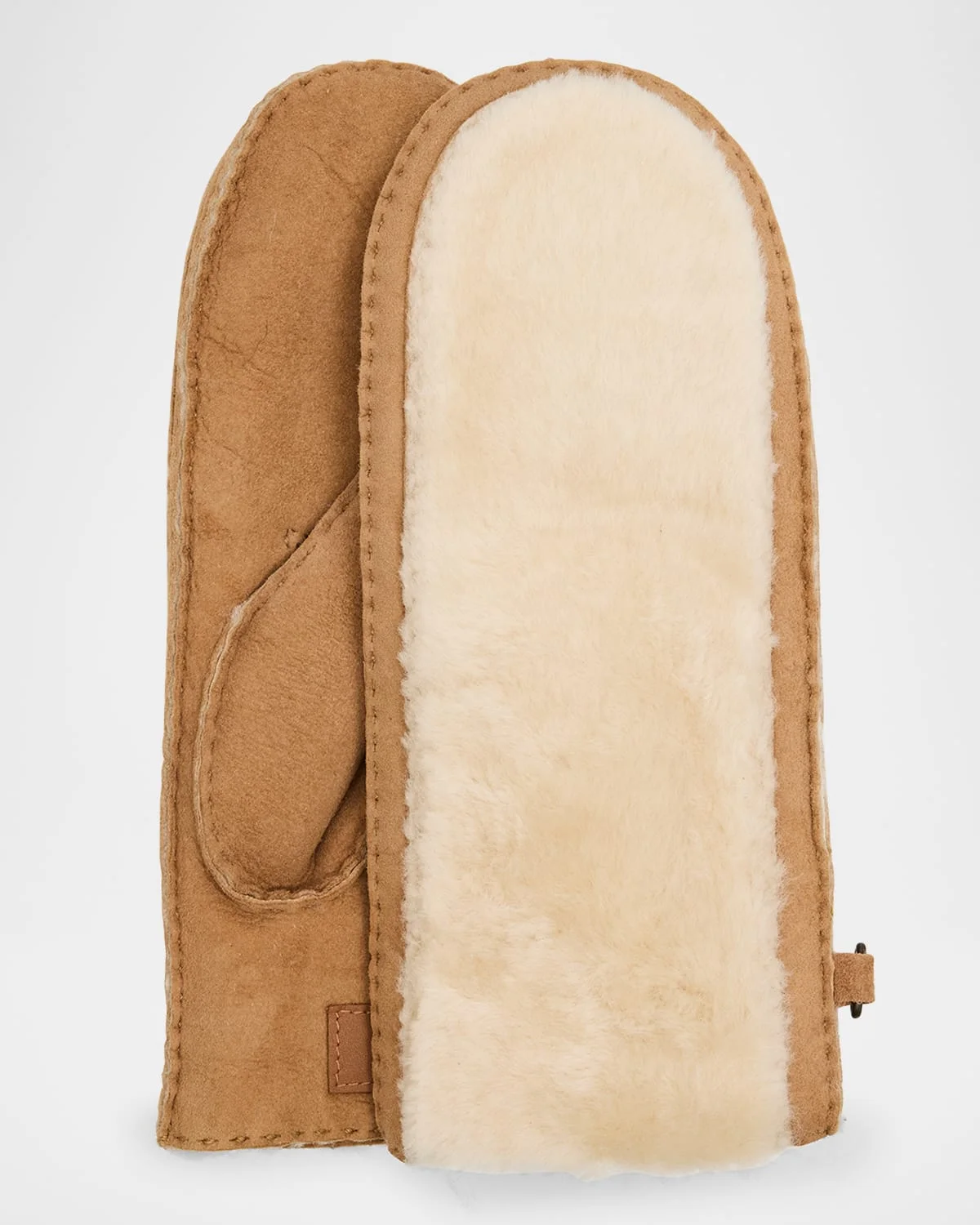 UGG mittens with exposed shearling (China) Features tonal stitching and logo patch Shearling Professional cleaning recommended, spot clean Imported