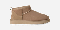 Our Classic Ultra Mini is one of our most coveted Classics. Built-in flair with a lower shaft which makes for easy on-off wear. Pre-treated to keep it looking better for longer, this Classic features everything you love about the original Classic Boot, like signature UGG® sheepskin and a flexible, ultra-lightweight sole. The outsole of this product is either a sugarcane EVA outsole, which is a responsible compound using sugarcane foam that allows us to reduce dependency on fossil fuels by replacing petroleum-based ethylene, or a Treadlite by UGG® outsole.This product was made in a factory that supports women in our supply chain with the help of Reimagining Industry to Support Equality (RISE). This collaborative initiative creates partnerships with brands like ours to empower and educate women in the workplace. Protected: Post Applied Treatment. Topically applied water repellency treatment. 17mm Twinface sheepskin upper. Asymmetrical topline, Overlock stitch detailing on seams, Rear pull tab, Suede heel counter. 17mm sheepskin lining. 17mm UGG®plush 80% upcycled wool, 20% TENCEL Lyocell insole or 17mm UGG®plush 60% upcycled wool, 40% TENCEL Lyocell insole or 17mm sheepskin insole. Sugarcane EVA outsole or Treadlite by UGG® EVA outsole. Polyester binding or textile binding made from 100% recycled polyester fibers. 3.5 inch shaft height. The UGG® Logo embossed leather heel label. Best for: Casual. RN 88276. This product contains real fur from sheep or lamb. Fur may be sourced from Australia, Ireland, the United Kingdom, or the United States. It has been artificially dyed and treated.. UGG® Women's Classic Ultra Mini Sheepskin Classic Boots in Sand, Size 12