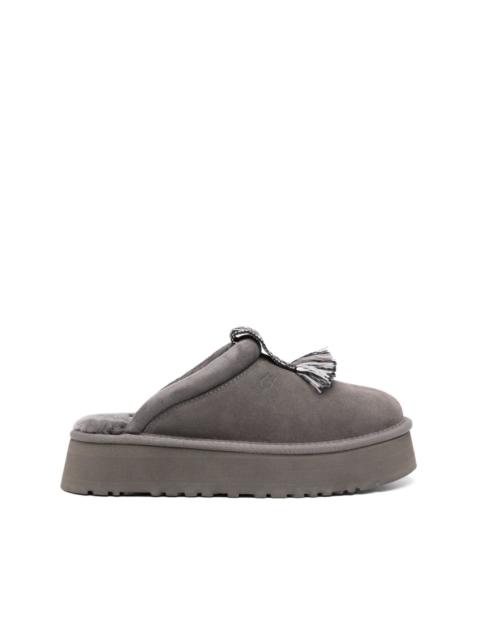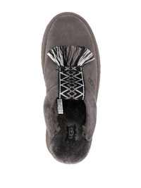 Tazzle suede slippers UGG’s grey Tazzle slippers put a fresh spin on the hallmark designs details of their Tasman prototype. The signature braided trims are reinterpreted as a tasselled tab at the vamp, while the UGGplush™ lining and flatform sole maintain their versatile indoor and outdoor adaptability. Highlights - Dark grey - Calf suede - Debossed logo to the side - Braid detailing - Tassel detail - Round toe - Signature uggplush™ lining - Branded insole - Platform sugarcane eva outsole - Slip-on style Imported Composition Outer: Fabric 100%, Calf Suede 100% Lining: Fabric 100%, Calf Leather 100% Sole: Rubber 100% SIZE & FIT Measurement HEEL 1.57 in(4 cm) Sole height 1.37 in(3.5 cm)