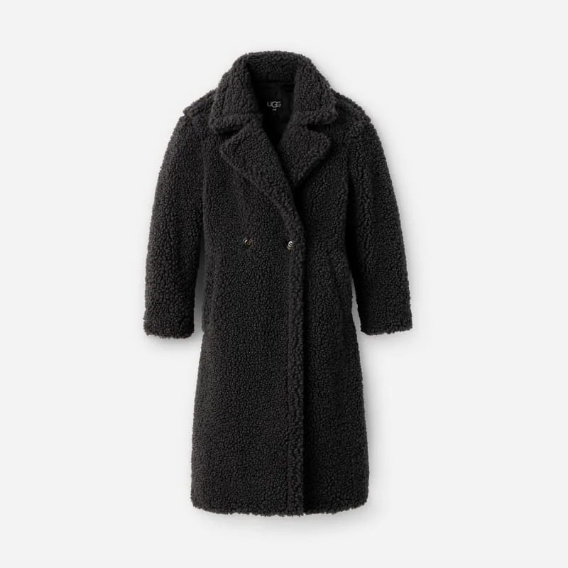 Meet your ultimate fall statement piece: Gertrude. This Long Teddy Coat is luxe, versatile, and adds a layer of textured warmth to any outfit this chilly season. Relaxed-fit full-length double-breasted teddy coat. Self - 100% Polyester. Lining - 100% Polyester. The UGG® Logo faux horn buttons. Soft fleece inchhand warmer inch pocket lining. 47 inch HPS Length [Size S]. 47 inch HPS Length [Size 2X]. Dry clean only. Imported. UGG® Women's Gertrude Long Teddy Coat Faux Fur in Ink Black, Size L