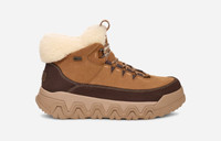 We might've made the most iconic winter boot. Our Terre Trail Cozy Lace is comfy, functional, and ridiculously cute. It's designed with waterproof suede and a curly faux-fleece collar from recycled fibers that serves timeless chilly season style. Immerse yourself in warmth with the soft faux-fleece lining and our toasty UGG®plush sock lining. To ensure the Terre Trail Cozy Lace is up to the wintery task, we've opted for a Spider Rubber outsole that delivers enhanced traction. Waterproof. Waterproof membrane bootie construction. Waterproof suede. Gusseted tongue with water repellent coating. 7mm curly fluffy poly knit upper made with 100% recycled polyester fibers upper. Padded collar. Recycled polyester laces, Non-wicking laces, Metal lace D-rings, Non-wicking laces made with 100% recycled polyester fibers. Mix fleece lining textile (65% recycled polyester, 35% polyester), 7mm curly fluffy poly knit lining on collar and tongue made with 100% recycled polyester fibers. 7mm UGG®plush 60% upcycled wool, 40% TENCEL Lyocell socklining. Foam footbed. Midsole incorporates sugarcane EVA. Spider Rubber outsole for traction. The UGG® Logo, heat-embossed, Woven label with The UGG® Logo on insole. Best for: Casual, Light or moderate rain, Light snow. RN 88276. UGG® Women's Terre Trail Cozy Lace Suede/Waterproof Boots in Chestnut, Size 7