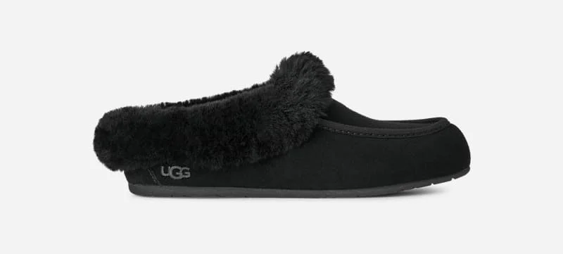 This is luxury seen through the UGG® lens. Our Ansley Mule is an all-new take on heritage elements, from the premium sheepskin collar to the smooth suede upper. It has a soft UGG®plush lining and a rubber outsole that can be worn indoors and out. Suede upper. Sheepskin collar, Suede heel counter, Suede vamp. 10mm UGG®plush 60% upcycled wool, 40% TENCEL Lyocell vamp lining. 17mm UGG®plush 60% upcycled wool, 40% TENCEL Lyocell sockliner. Rubber outsole. Woven label with The UGG® Logo on insole. RN 88276. This product contains real fur from sheep or lamb. Fur may be sourced from Australia, Ireland, the United Kingdom, or the United States. It has been artificially dyed and treated.. UGG® Women's Ansley Mule Sheepskin Slippers in Black, Size 8