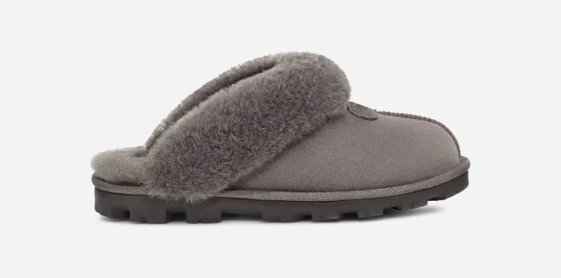 If the world is a stage, our Coquette always snags the leading role. Coquette is cute, comfy, and committed to your self-care. As soft as it is versatile, our Coquette features our soft sheepskin and a lightweight sole that easily travels indoors and out. The outsole of this product is either a sugarcane EVA outsole, which is a responsible compound using sugarcane foam that allows us to reduce dependency on fossil fuels by replacing petroleum-based ethylene, or a Treadlite by UGG® outsole.This product was made in a factory that supports women in our supply chain with the help of Reimagining Industry to Support Equality (RISE). This collaborative initiative creates partnerships with brands like ours to empower and educate women in the workplace. 17mm Twinface sheepskin upper. 17mm sheepskin insole. Sugarcane EVA outsole or Treadlite by UGG® EVA outsole. Polyester binding or textile binding made from 100% recycled polyester fibers. Suede label with embossed The UGG® Logo. RN 88276. This product contains real fur from sheep or lamb. Fur may be sourced from Australia, Ireland, the United Kingdom, or the United States. It has been artificially dyed and treated.. UGG® Women's Coquette Durable Sheepskin Slipper in Grey/, Size 10