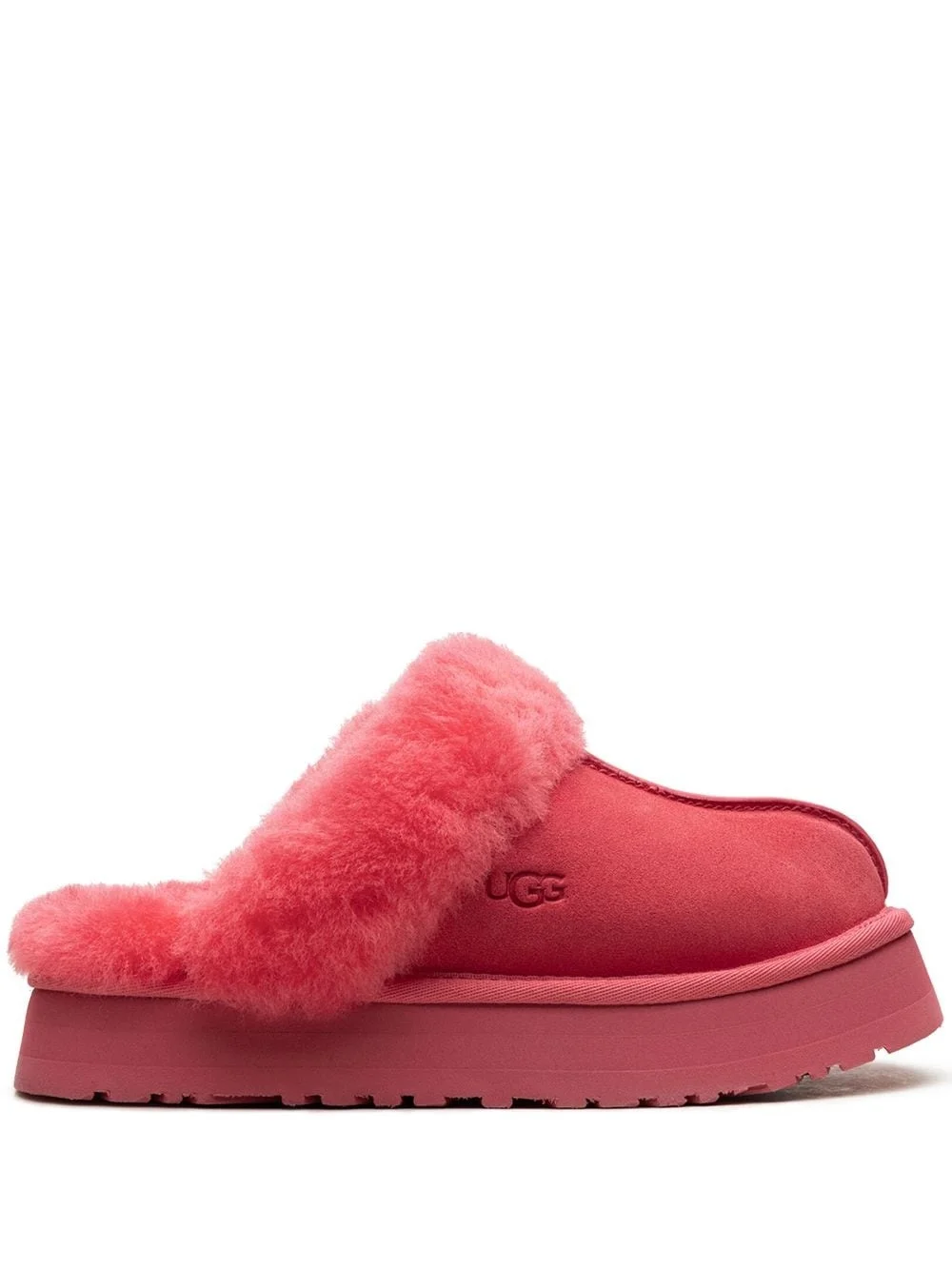 Disquette shearling platform slippers UGG merges two of its signature silhouettes - the Coquette and Disco - to create this new design, elevating the brand's classic slipper with a platform sole for a maximalist look. The shearling-lined interior maximises the pair's comfort. Highlights - Pink - Shearling lining - Slip-on style - Embossed logo to the side - Round toe - Platform sole Imported Composition Outer: Suede 100%, Sheep Skin/Shearling 100%, Recycled Polyester 100% Lining: Sheep Skin/Shearling 100% Sole: Polyethylene vinyl acetate (PEVA) 100% SIZE & FIT FittingInformation This piece fits small – take one size up Measurement PLATFORM 1.57 in(4 cm)