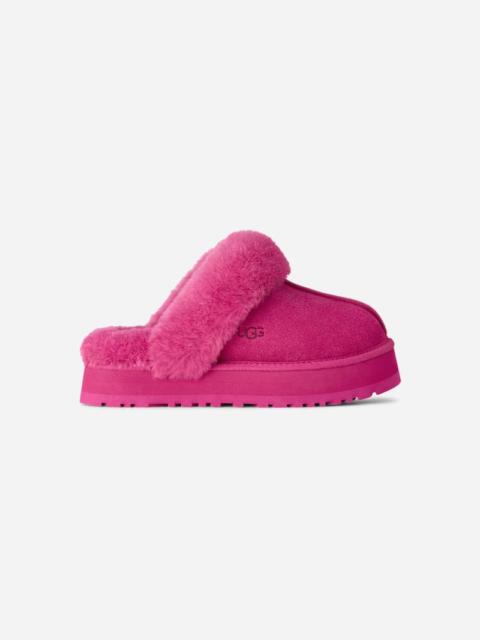 How would you describe yourself? Totally unique? Like to stand out? Want to try both for the first time? Then you are definitely on the right page. Our Disquette adds a 1 inch retro-style platform sole to a familiar slip-on silhouette for outdoor wear, an all-day cushion, and a maximalist look. Crafted from our signature sheepskin and suede, this effortless style adds a playful statement to your life.The outsole of this product is either a sugarcane EVA outsole, which is a responsible compound using sugarcane foam that allows us to reduce dependency on fossil fuels by replacing petroleum-based ethylene, or a Treadlite by UGG® outsole.This product was made in a factory that supports women in our supply chain with the help of Reimagining Industry to Support Equality (RISE). This collaborative initiative creates partnerships with brands like ours to empower and educate women in the workplace. Suede upper. Sheepskin collar. 17mm sheepskin lining. 17mm sheepskin insole. EVA midsole. Sugarcane EVA outsole or Treadlite by UGG® EVA outsole. Textile binding made from 100% recycled polyester fibers. 1 inch platform height. Woven label with The UGG® Logo on insole, The UGG® Logo, heat-embossed. RN 88276. This product contains real fur from sheep or lamb. Fur may be sourced from Australia, Ireland, the United Kingdom, or the United States. It has been artificially dyed and treated.. UGG® Women's Disquette Sheepskin Slippers in Chestnut, Size 12