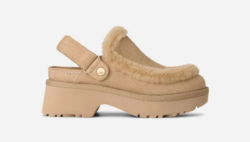 Evolution is a way of life, and our Heritage details have taken on a new form with our Esmee Clog. Designed with comfort so plush you can see it, it has a genuine suede upper and a lush sheepskin spill seam. Slip into the comfort of the lamb leather footbed and secure your fit with the adjustable heel strap, or swivel the strap to the front for backless clog comfort. Finished with a 2 inch heel made from lightweight EVA for effortless support.This product was made in a factory that supports women in our supply chain with the help of Reimagining Industry to Support Equality (RISE). This collaborative initiative creates partnerships with brands like ours to empower and educate women in the workplace. Suede upper. 10mm sheepskin spill seam. Adjustable heel strap, Hook-and-loop closure. Textile lining made from 100% recycled polyester fibers. Leather sockliner. Leather lined footbed. EVA outsole. 2 inch heel height. The UGG® Logo, heat-embossed. RN 88276. This product contains real fur from sheep or lamb. Fur may be sourced from Australia, Ireland, the United Kingdom, or the United States. It has been artificially dyed and treated.. UGG® Women's Esmee Clog Sheepskin Shoes in Mustard Seed, Size 7