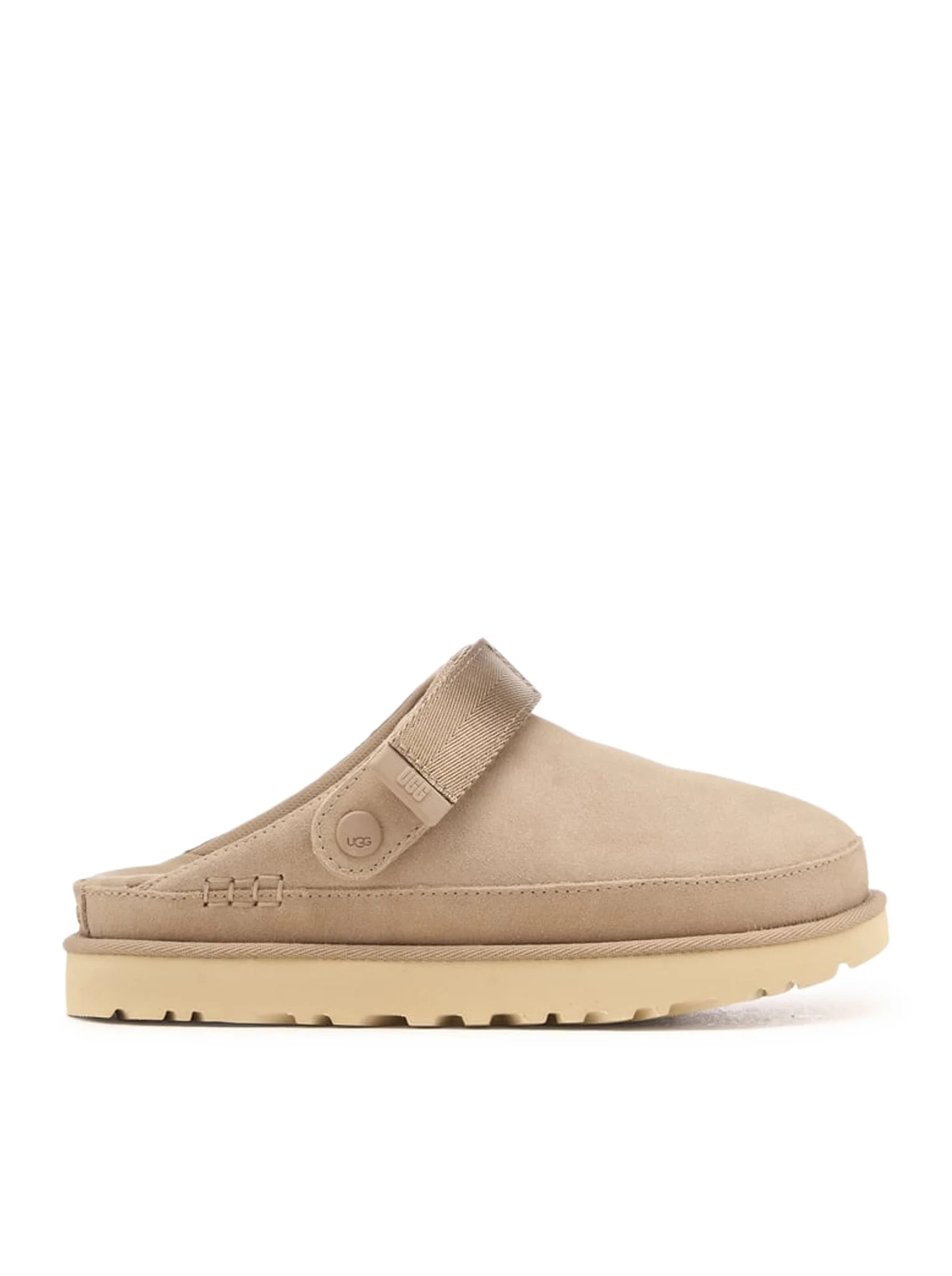 - Suede upper, durable fabric heel strap - Adjustable heel strap, Velcro closure, TPU strap ends with UGG® graphics - Textile lining made from 100% recycled polyester fibers - Textile insole made from 100% recycled polyester fibers - Molded EVA insole - Sugarcane EVA midsole, made from reground recycled EVA - Sugarcane EVA outsole - Recycled polyester trim - Embossed UGG® logo - Color: Sand Made in Philippines Composition: Leather 100% Leather Color code: SAN SAND 1138252SAN