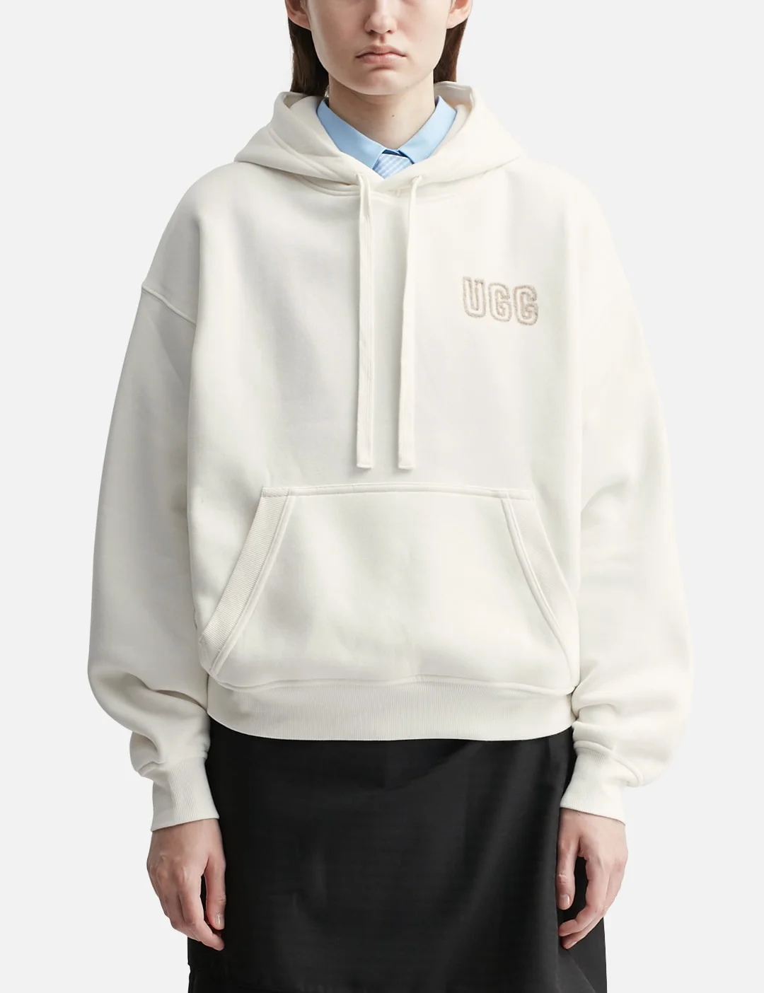 - UGG - UGG Logo Hoodie - Hood with drawcord - Made with responsible cotton and recycled polyester - Graphic UGG® Font applique in chenille knit yarn - Kangaroo pocket - Ribbed cuffs and hem - Color: Nimbus - Material: 55% Responsible Cotton, 45% Recycled Polyester; Rib knit: 96% Responsible Cotton, 4% Elastane - See more Hoodies and Clothing - Model wears size S - Model measures: Height 180cm, Chest 28.3’’/72cm, Waist 22’’/56cm, Hip 35’’/89cm - Vendor Code: 2UG1171478NMB