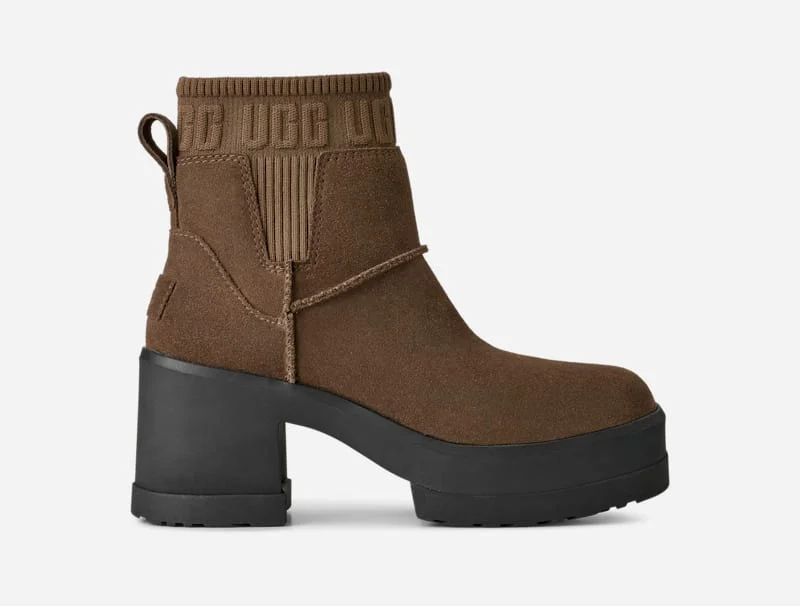 If you love our Brooklyn boot, you'll adore our Moxy Chelsea. It delivers the features you love about the Brooklyn like the chunky lug sole, Twin Seam details, and The Graphic UGG® Font knit gore, and adds a chic, square toe. The upper is crafted with water-resistant suede and lined with soft microfiber for wear-all-day comfort. Set upon a lightweight rubber outsole that adds 2 inch of height at the platform, and 3 inch at the heel.This product was made in a factory that supports women in our supply chain with the help of Reimagining Industry to Support Equality (RISE). This collaborative initiative creates partnerships with brands like ours to empower and educate women in the workplace. Protected: Waterproof or Water-Resistant Materials. Water-resistant suede. Suede upper. Rear pull tab, The Graphic UGG® Font knit gore. Textile lining (51% UNIFI RPET, 49% polyester), Microfiber lining. Synthetic sockliner (40% PU, 60% Polyester). Synthetic sockliner & Foam footbed. Lightweight rubber outsole with EVA fill. 5.5 inch shaft height. 3.5 inch heel height. The UGG® Logo, embossed suede heel label, The UGG® Logo screen printed on footbed. Best for: Casual. RN 88276. UGG® Women's Moxy Chelsea Suede Boots in Dark Toffee, Size 7
