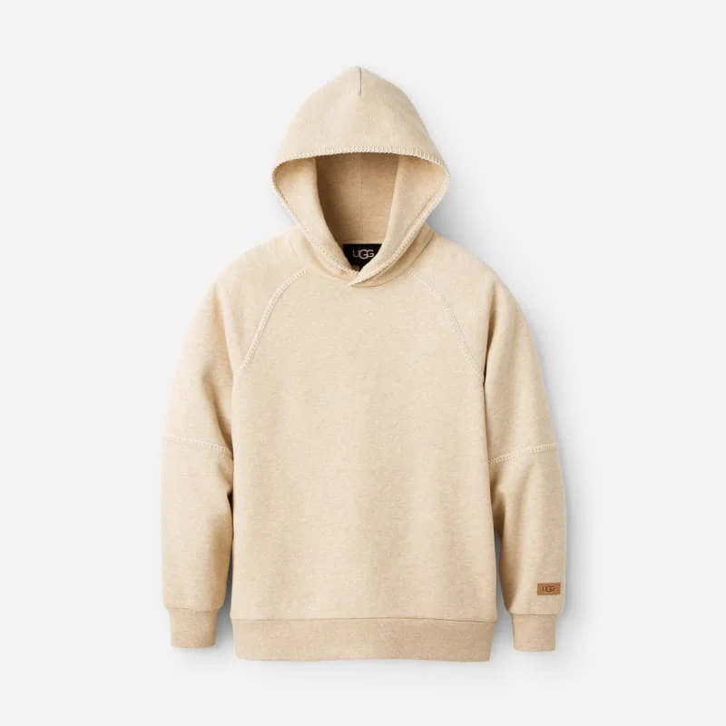 Our Classic Hoodie embodies the spirit of our Classic Boot in an equally cozy sweatshirt. Designed with brushed-back fleece, whipstitch detailing, and an overlapping neckline, this is one hoodie you won't want to lend out. We recommend pairing the Classic Hoodie with the Classic Sweatpant for an elevated level of UGG® comfort. Oversized-fit hooded sweatshirt. Self - 55% Responsible Cotton/45% recycled polyester. Rib Knit - 96% Responsible Cotton/4% elastane. Responsible Cotton means: responsible cotton sourcing scheme cotton, recycled cotton, or organic cotton. Lining - Unlined. Whipstitch detail on seams. Side seam pockets. The UGG® License Plate, leather label. 27 inch HPS length [size S]. 29 3/4 inch HPS [size 2X]. Pairs with the Classic Sweatpant. Imported. UGG® Women's Classic Hoodie Cotton Blend/Recycled Materials Hoodies & Sweatshirts in Sand Heather, Size 3X