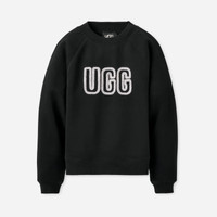 Our UGG® Logo Crewneck is a casual classic made with a soft cotton blend with Responsible Cotton. Featuring raglan sleeves and our Graphic UGG® Font made from chenille knit yarn, this sweatshirt is destined to be your favorite on days that end with Y. Relaxed-fit crewneck sweatshirt. Self - 55% Responsible Cotton/45% recycled polyester. Rib knit - 96% Responsible Cotton/4% elastane. Responsible Cotton means: responsible cotton sourcing scheme cotton, recycled cotton, or organic cotton. Lining - Unlined. The Graphic UGG® Font applique in chenille knit yarn. Rib knit neckline, cuffs, and hem. 24 inch HPS length [size S]. 27 inch HPS length [size 2X]. Imported. UGG® Women's UGG® Logo Crewneck Cotton Blend Tops in Black, Size M