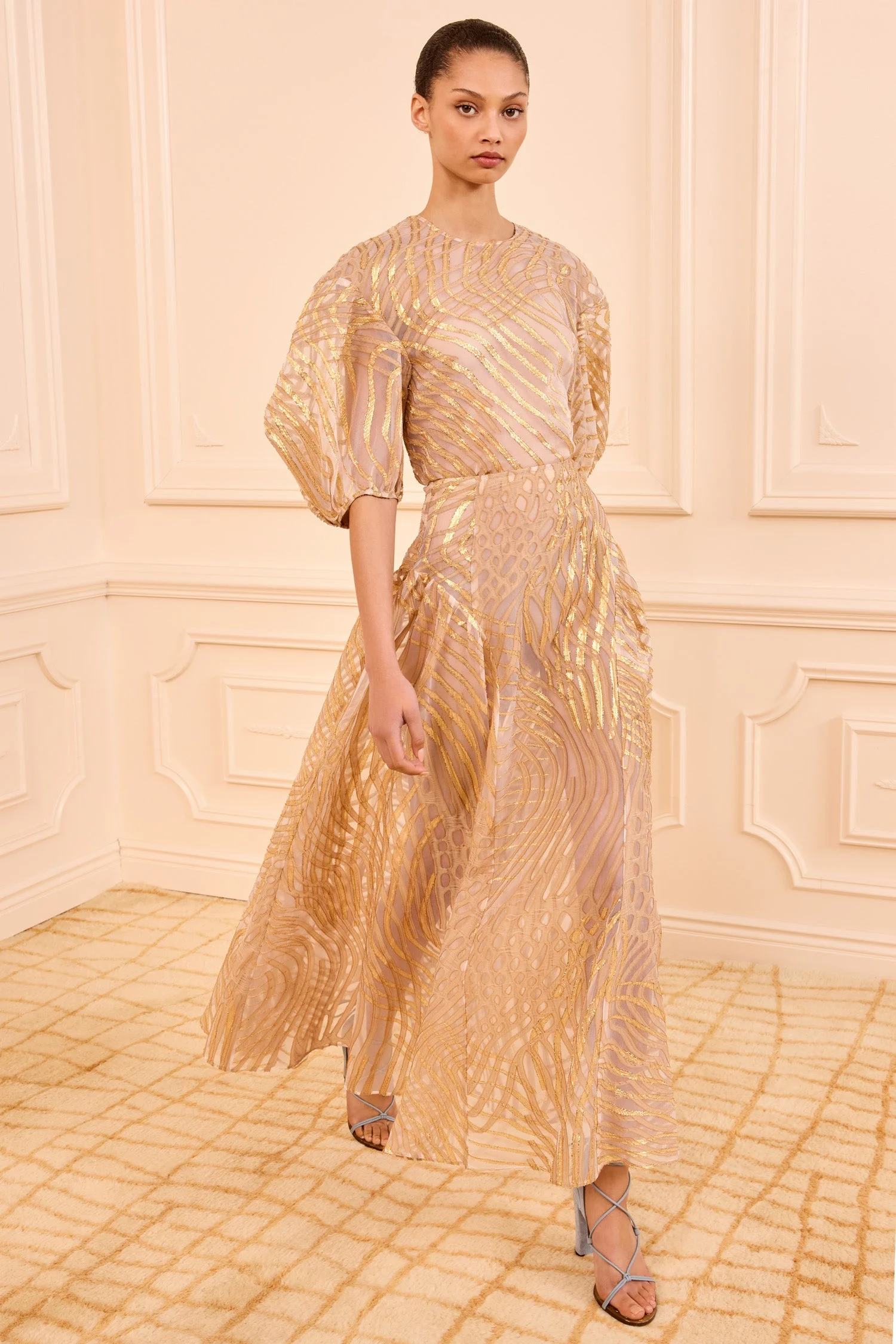 Seen in Look 20 on the SS26 Runway, the Adrienne Skirt is a full, sculptural silhouette crafted in fil coupe organza with a wave motif that echoes feathery gestures. Fitted at the waist, it’s defined by voluminous side panels that highlight the fabric’s textural complexity. - Italian lurex wave fil coupe - Model Height: 5'10" - Elongated midi length, super high-rise waist - Fully lined - Concealed back zipper - Composition: 37% polyester, 25% polyamide, 23% silk, 15% metalized polyester - Delicate dry clean only - Style# SP260329