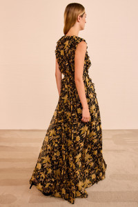The Aida Gown is richly adorned with palm florals and metallic dots that flutter atop airy chiffon. This multicolored dress billows in length and is finished with knife-pleated ruffles that cascade vertically throughout. - Metallic fil coupe chiffon - Model Height: 5'11" - V-neckline - Sleeveless - Side pockets - Concealed side zipper - Composition: 91% silk, 9% metalized polyester - Dry clean only