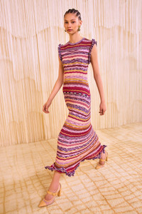Skimming the form, the Ajak Dress is rib-knitted from space-dyed yarns that create a hypnotic melding of stripes and is detailed throughout with pointelle trims. This sleeveless multicolored dress has a classic round neckline and is playfully accented with ruffles at the armholes and midi hemline. It easily pulls over. Composition: 50% Rayon, 40% Cotton, 10% Lycra Size & Fit - Model Height: 5'10"
