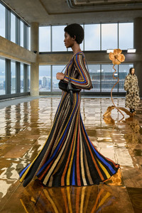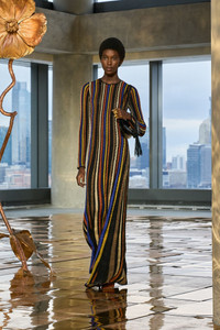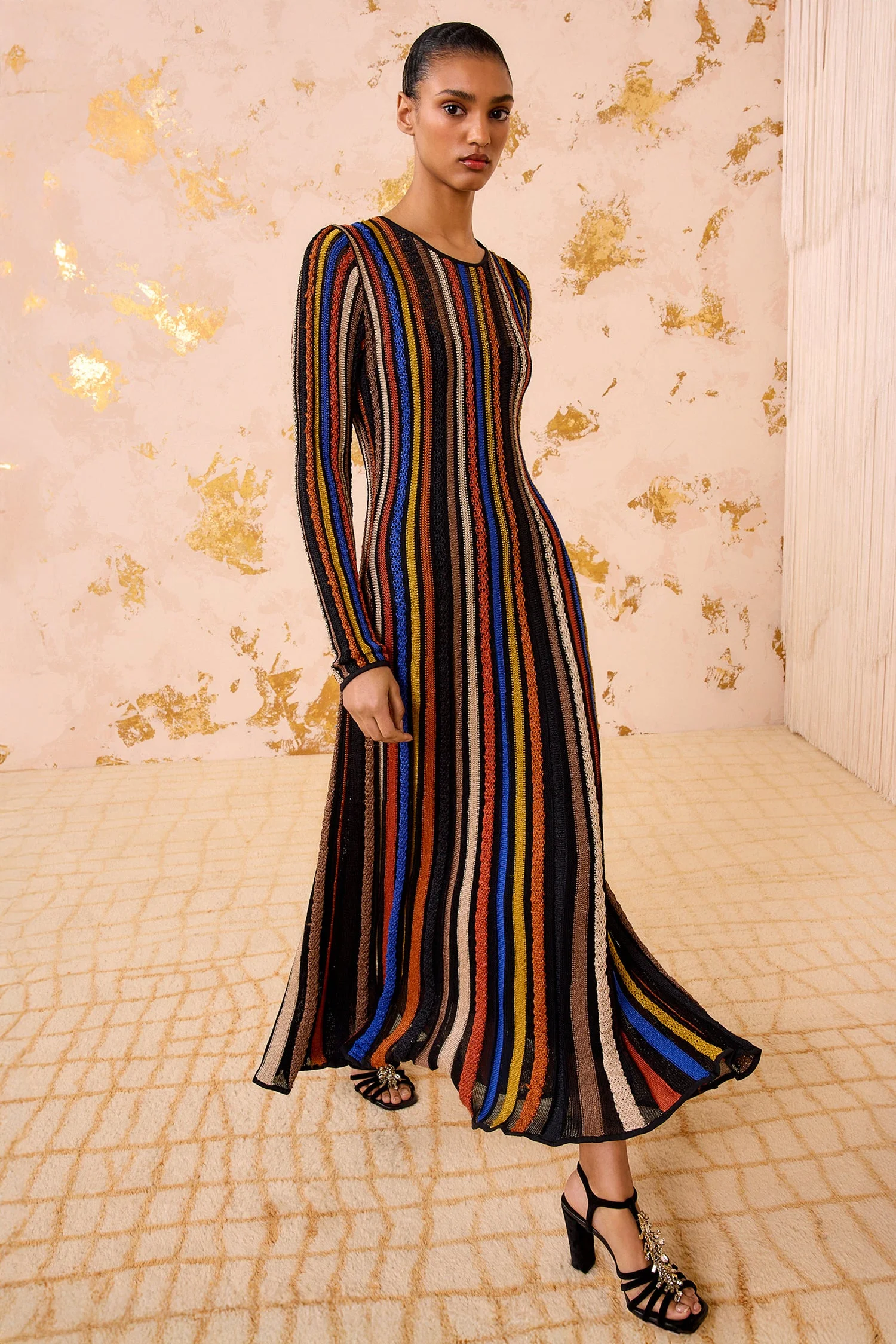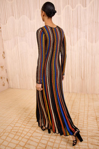 Debuting in Look 28 on our AW25 runway, the Albie Dress features a multicolored, body-skimming silhouette knitted with variegated stitches that add definition to its subtle graphic beauty—note how the stripes expand from narrow in the bodice to full at the floor-length hemline. - Knitted - Model Height: 5'10" - Designed for a close fit, flares at hem. - Maxi length - Long sleeves - Removable slip - Pullover style - Composition: 80% nylon, 20% viscose - Dry clean only