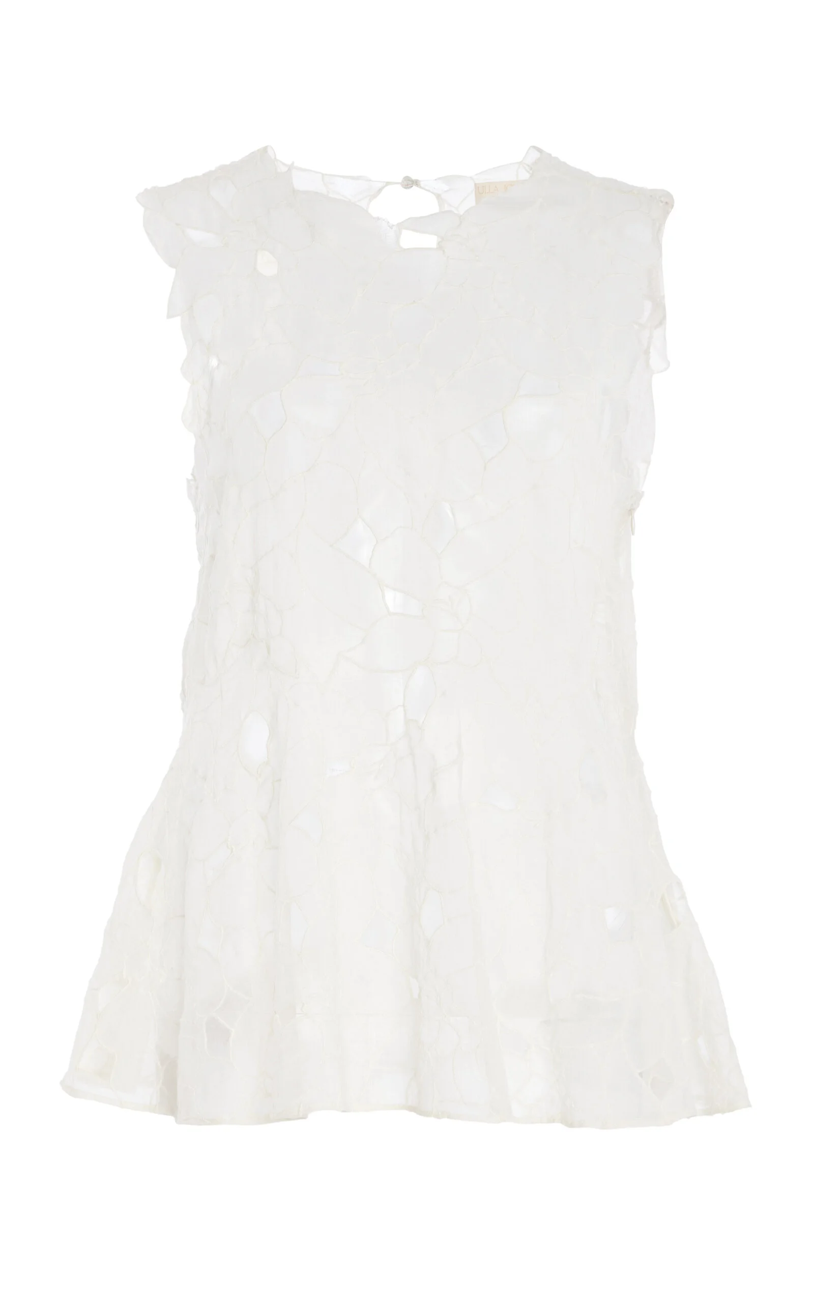 PRODUCT DETAILS - Slim fit, sleeveless with floral cut outs on neckline, pleated by the torso - Pull-on style with center back keyhole - Unlined - Composition: 100% Cotton - Color: white - Dry Clean Only - Pre-Fall '25