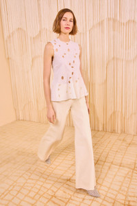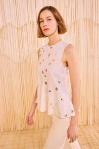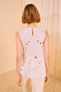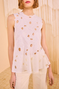 A display of refined craft, the Ali Top is cut from soft cotton organdy that’s artfully embroidered with a wildflower motif and cutout with petal shapes for playful transparency. Carefully engineered for a seamless finish, this sleeveless top fits close at the bust and releases at the waist into fluid volume. It fastens with a back buttoned keyhole and pairs effortlessly with our handmade denim. Composition: 100% Cotton Size & Fit - Model Height: 5'10" - This top is designed to be fitted at the bust and waist and is loose at the hem.