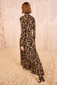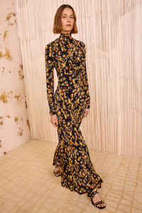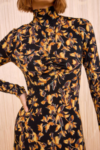 The Koa Dress is crafted from signature tricot jersey adored for its silky-soft feel, patterned with hyper-vibrant florals against a black backdrop. This multicolored dress has a ruched front that lightly sculpts, while the maxi silhouette enhances the form. - Tricot jersey - Model Height: 5'10" - Designed for a close fit, gently flares at hem. - Maxi length - Turtleneck - Long sleeves - Pullover style - Composition: 91% rayon, 9% elastane - Gentle machine wash