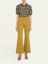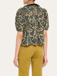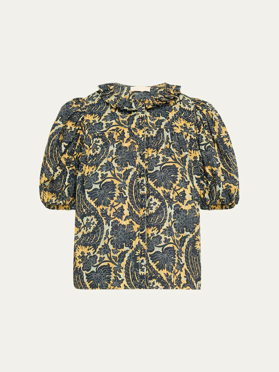 Ulla Johnson "Amari" printed blouse enhanced with a ruffled crew neckline Short puff sleeves Classic fit Hem falls to the hip Button-front Cotton/viscose Hand wash Imported Online Inquiries: BGS21_T6PVL| Store Inquiries: #5021344