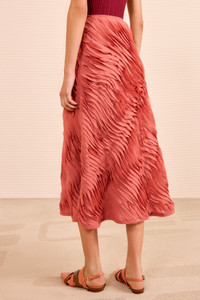 Evocative of spiraling brushstrokes, the Amiko Skirt is crafted from strips of raw, bias-cut chiffon that are embroidered on the fold into waving, linear motifs. This ethereal pink skirt is timeless in silhouette and has a gently flared midi hemline. - Chiffon - Model Height: 5'10" - Midi length, fixed mid-rise waist - Fully lined - Concealed side zipper - Composition: 100% polyester - Dry clean only