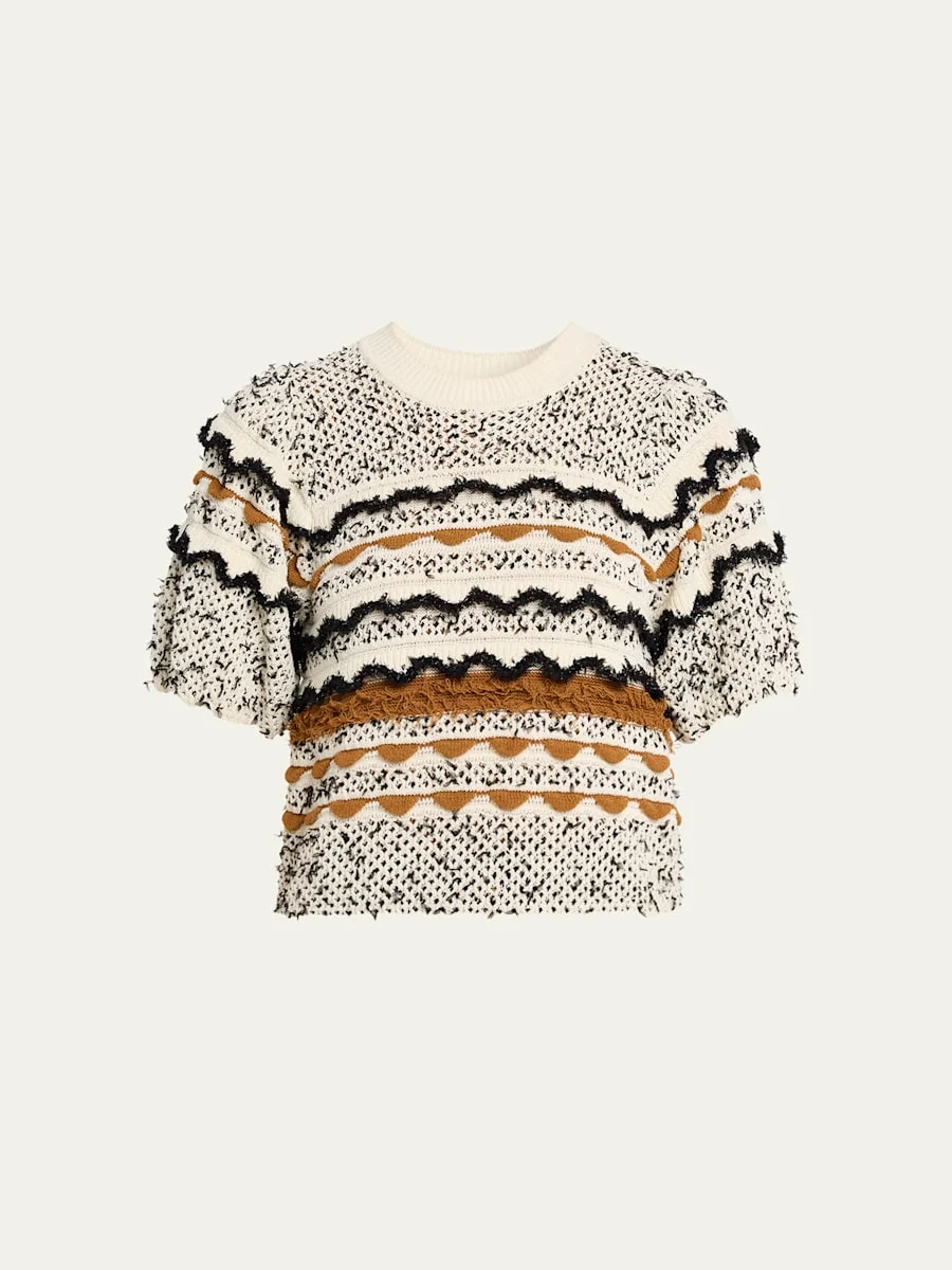 Ulla Johnson "Andira" sweater detailed with textural stripes Crew neckline Short sleeves Classic fit Hem sits at the hip Pullover style Polyester/cotton/linen Dry clean Imported