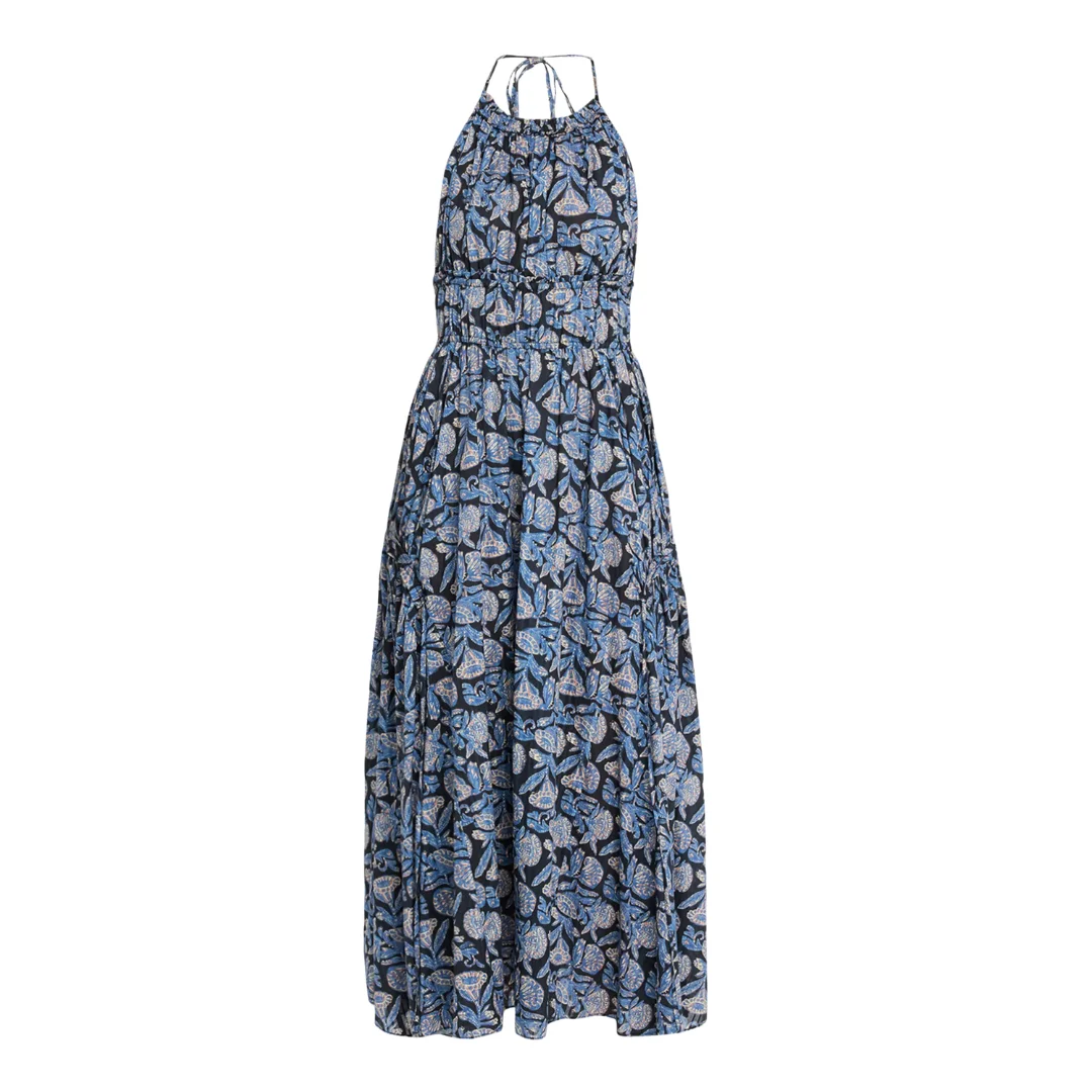 The Anelise Dress reveals a sense of elegant ease for sun-filled days. Crafted from airy cotton-blend, this multicolored dress is softly patterned with stripes and textured florals inspired by a batik print. - Shadow-striped cotton-blend - Designed to be fitted at the bust, elastic waist, loose at hip - Midi length - Halterneck - Elastic smocking at back panel - Ties at neck - Composition: 66% cotton, 34% viscose